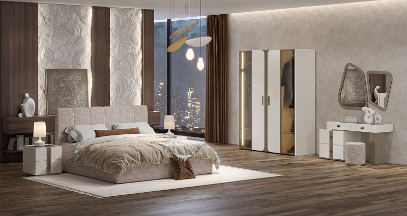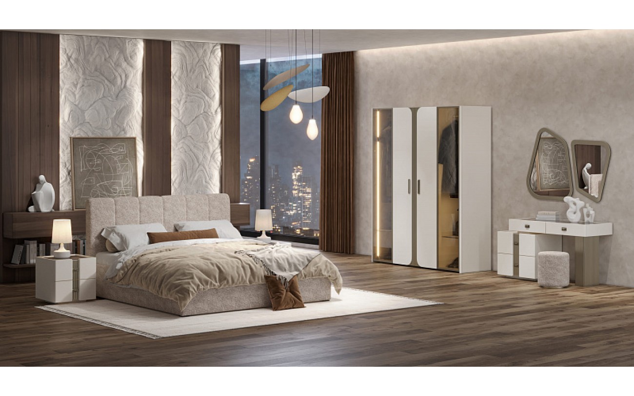 Спальня "Леонардо" (Кровать 1,6 с малым изголовьем; 2 тумбы; Туалетный стол с зеркалом и пуфом; Шкаф 4 дверный)