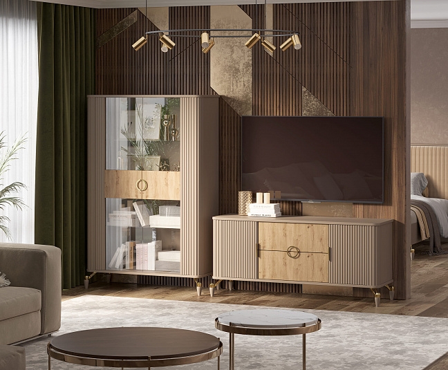 Благодаря вставкам под дерево "Дикий дуб натуральный" гостиная отражает тренд в мебели на экологичность. В коллекции нет ничего лишнего: простые и гармоничные формы. Округлые золотые ручки украшают и подчеркивают строгую деревянную текстуру.